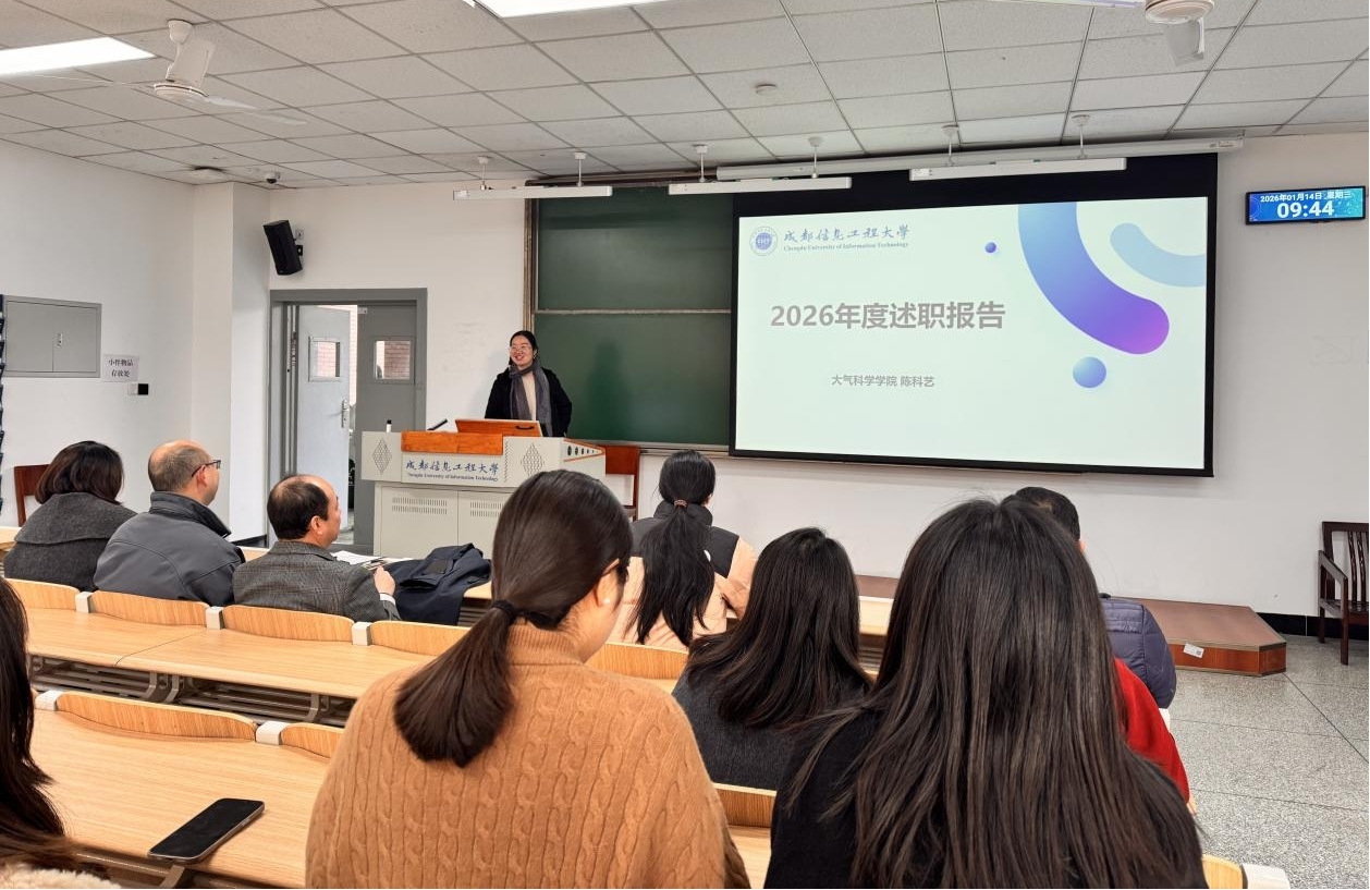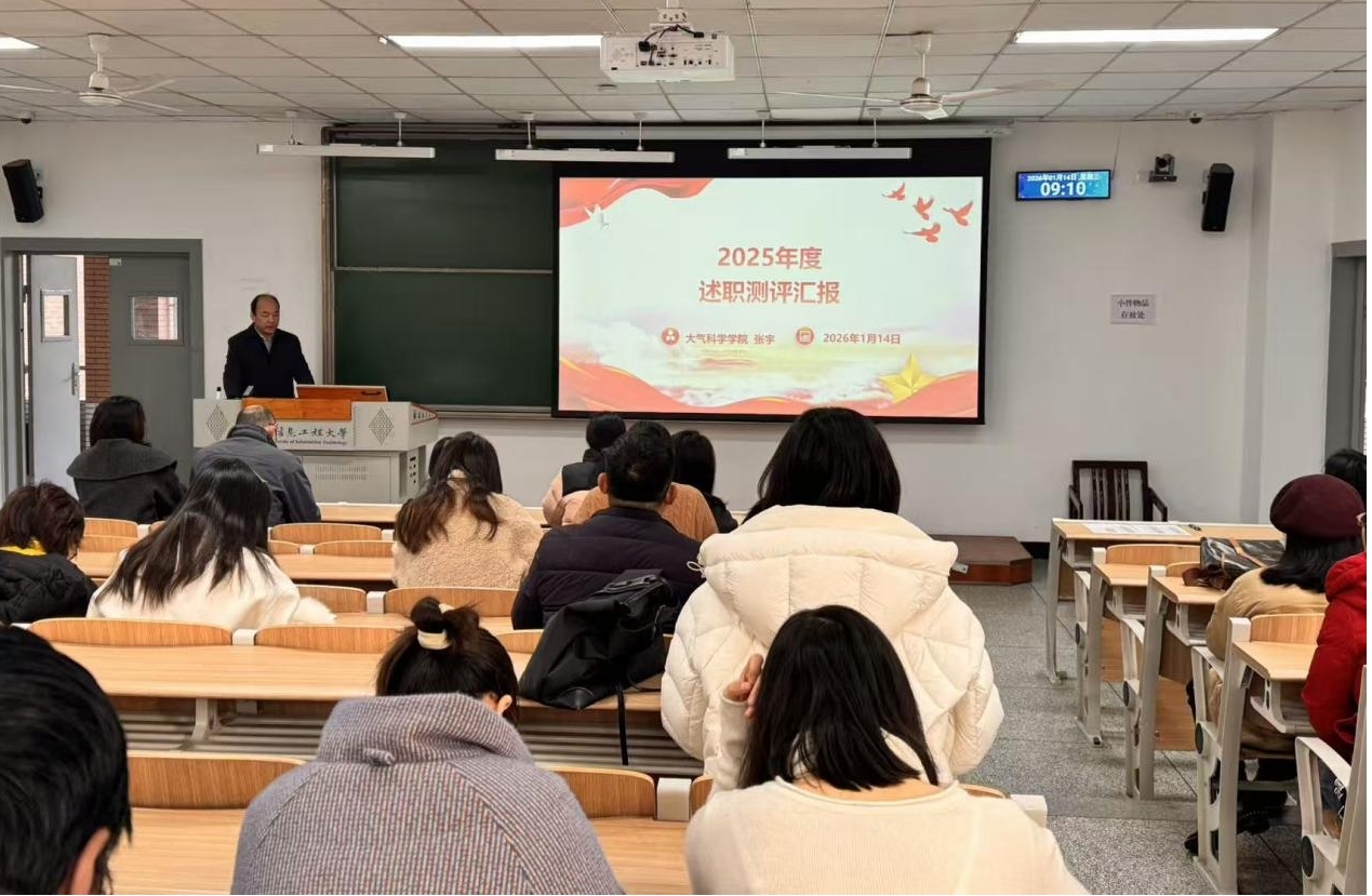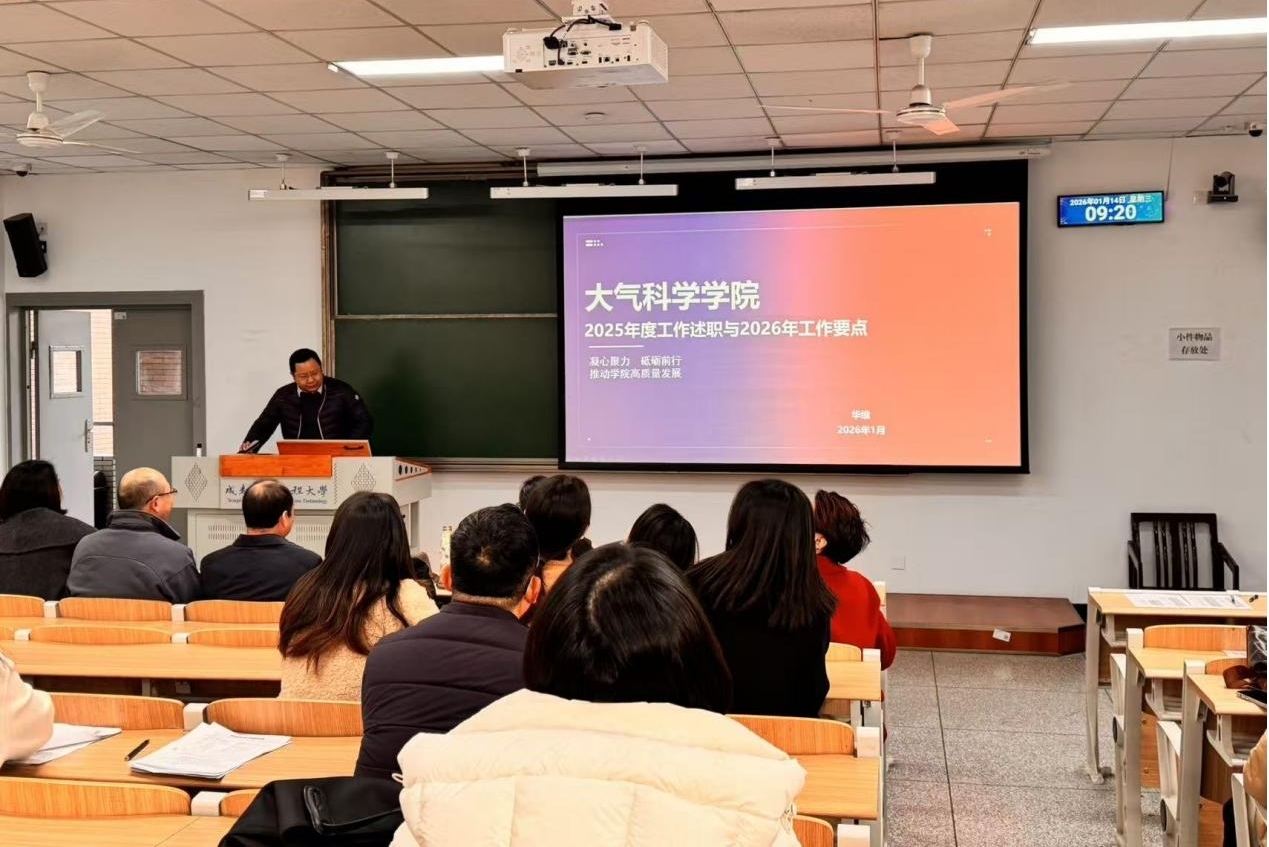 2026年1月14日上午,大气科学学院2025年度工作总结会议在一教学楼308召开。会议由党委副书记、院长华维主持,学院全体教职工参加此次会议。会上,中层干部作年度工作述职,围绕分管领域工作实绩、存在不足及未来规划进行详细汇报。