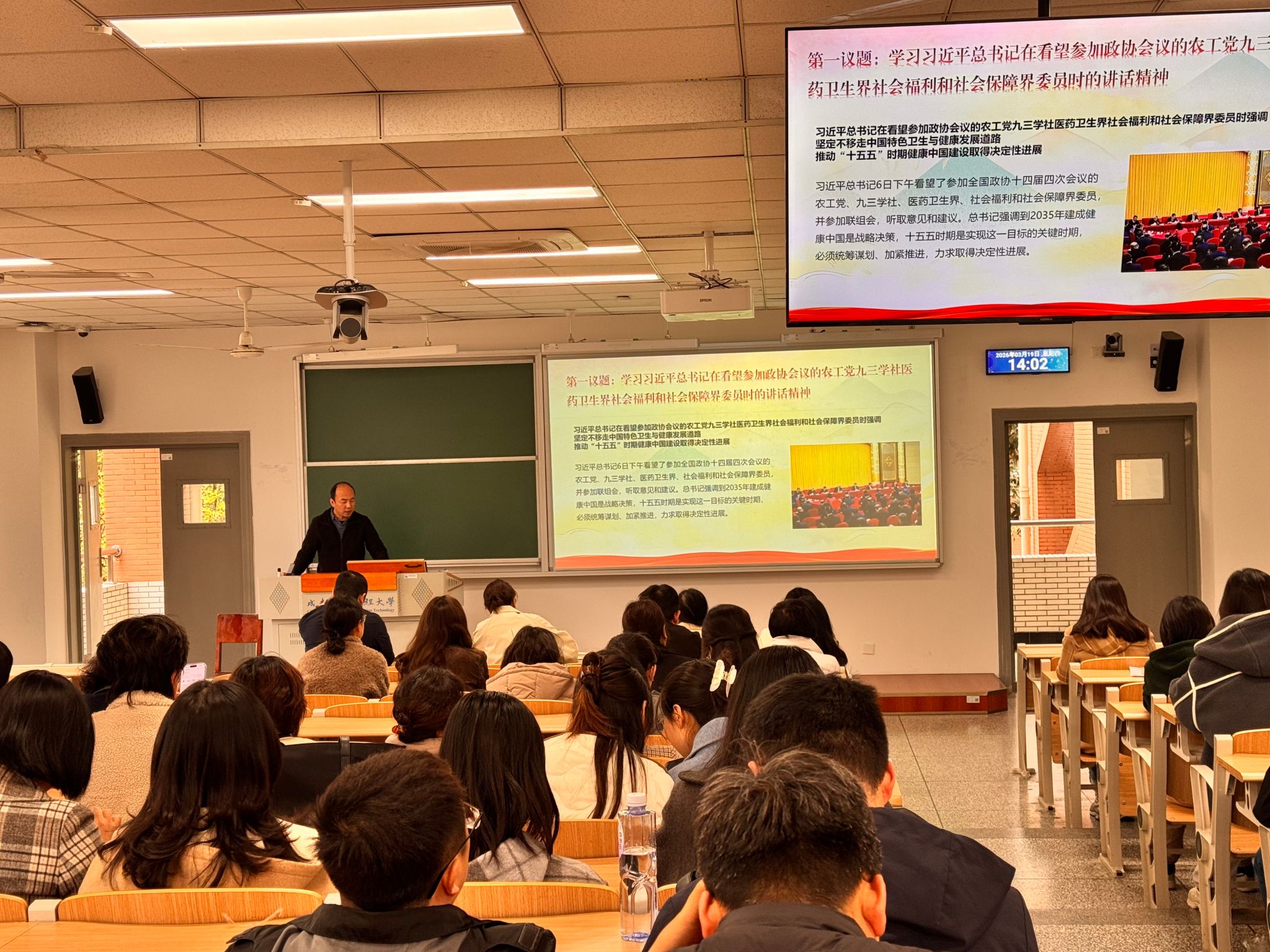 会上,学院党委书记张宇领学了习近平总书记在看望参加全国政协会议的农工党、九三学社、医药卫生界、社会福利和社会保障界委员时的重要讲话精神。会议强调,要深入学习贯彻习近平总书记重要讲话精神,坚定不移走中国特色卫生与健康发展道路,推动“十五五”时期健康中国建设取得决定性进展。接下来,张宇传达了关于开展树立和践行正确政绩观学习教育的通知精神。他指出,要坚持个人自学与集中学习相结合,通过理论学习中心组学习、专题研讨等方式,组织党员、干部深入学习领会习近平总书记重要论述的深刻内涵和实践要求;要通过党员大会、支委会等载体,扎实开展学习交流,并将《习近平总书记地方工作期间坚持正确政绩观生动实践》作为重要学习材料,增强学习的针对性和实效性。最后,通报了学院2025年度民主生活会相关情况。