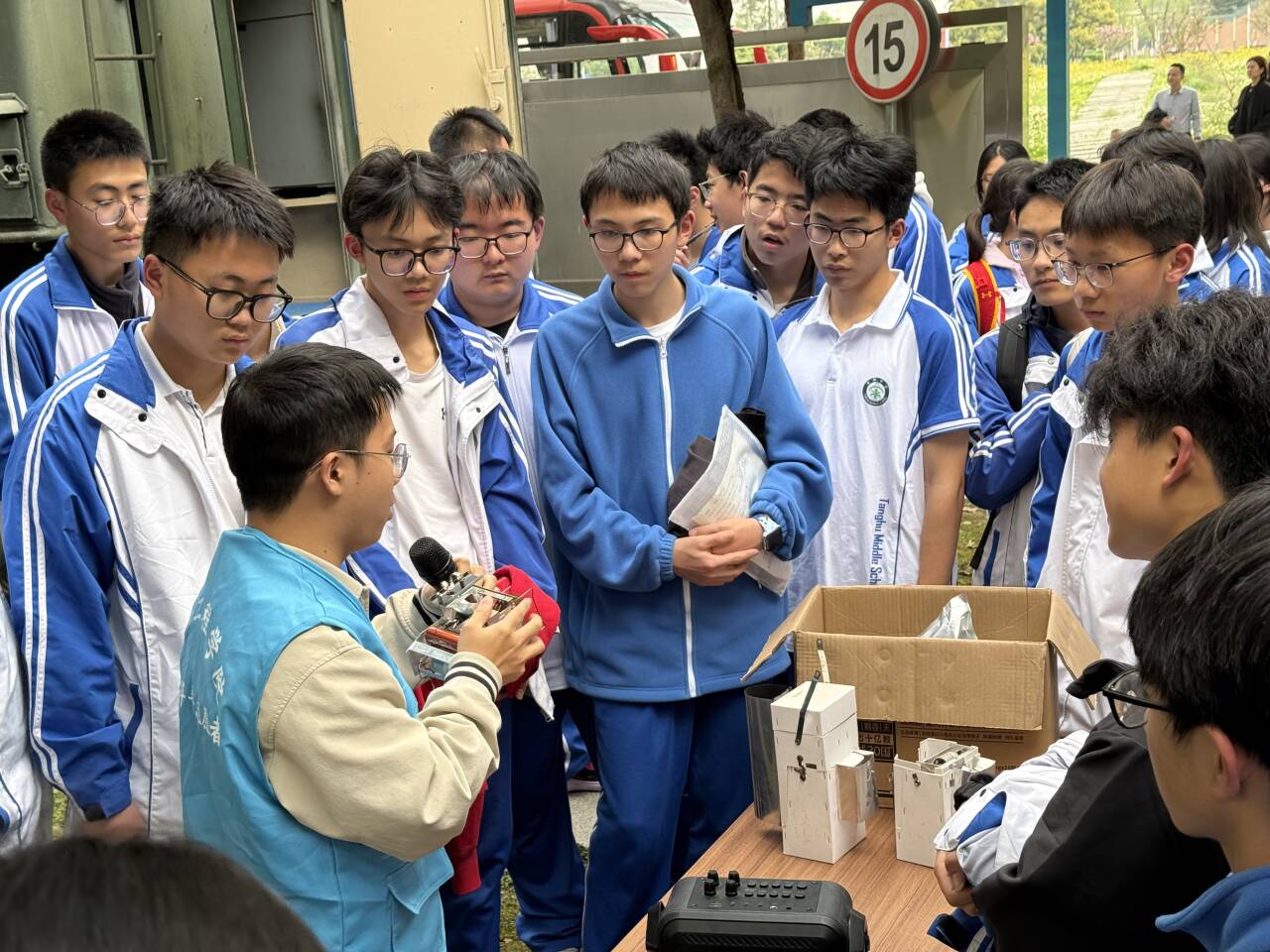 活动伊始,成都信息工程大学的志愿者们热情迎接棠湖中学师生,带领大家有序前往大气观测场。在观测场,志愿者结合各类气象观测仪器,为同学们细致讲解风速、风向、温度、湿度、气压等气象要素的观测原理与方法,从传统观测设备到现代化监测仪器,逐一拆解气象数据采集的奥秘。同学们认真聆听、积极提问,围绕仪器运作机制、数据应用场景等问题与志愿者深入交流,现场学习氛围浓厚。