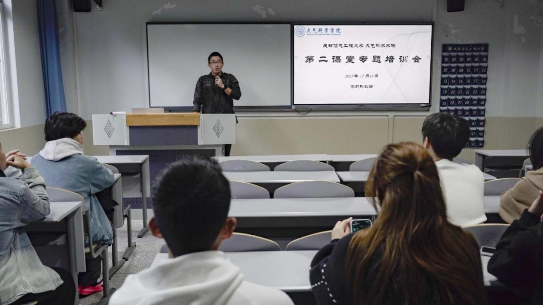 为进一步发挥“第二课堂”育人功能,帮助大一新生尽快熟悉平台操作与积分认定流程,切实解决学生在“第二课堂”中的实际问题,11月14日,大气科学学院团委学生会学习科创部在航空港校区4208教室组织召开了“第二课堂”专题培训会。本次培训由学习科创部“第二课堂”工作负责人李祉余主讲,2025级各班学生代表参与学习。