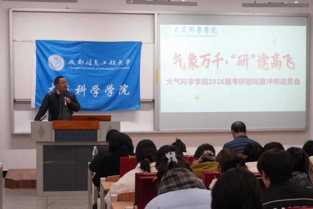 2025年12月11日,大气科学学院在H1101教室举办“气象万千·研途高飞”2026届考研慰问暨冲刺动员会,为即将踏上考场的学子们送上暖心的关怀与诚挚的祝福。学院党委书记张宇、院长华维、副院长曾胜兰及各年级辅导员参加活动。活动由辅导员罗米娜主持。