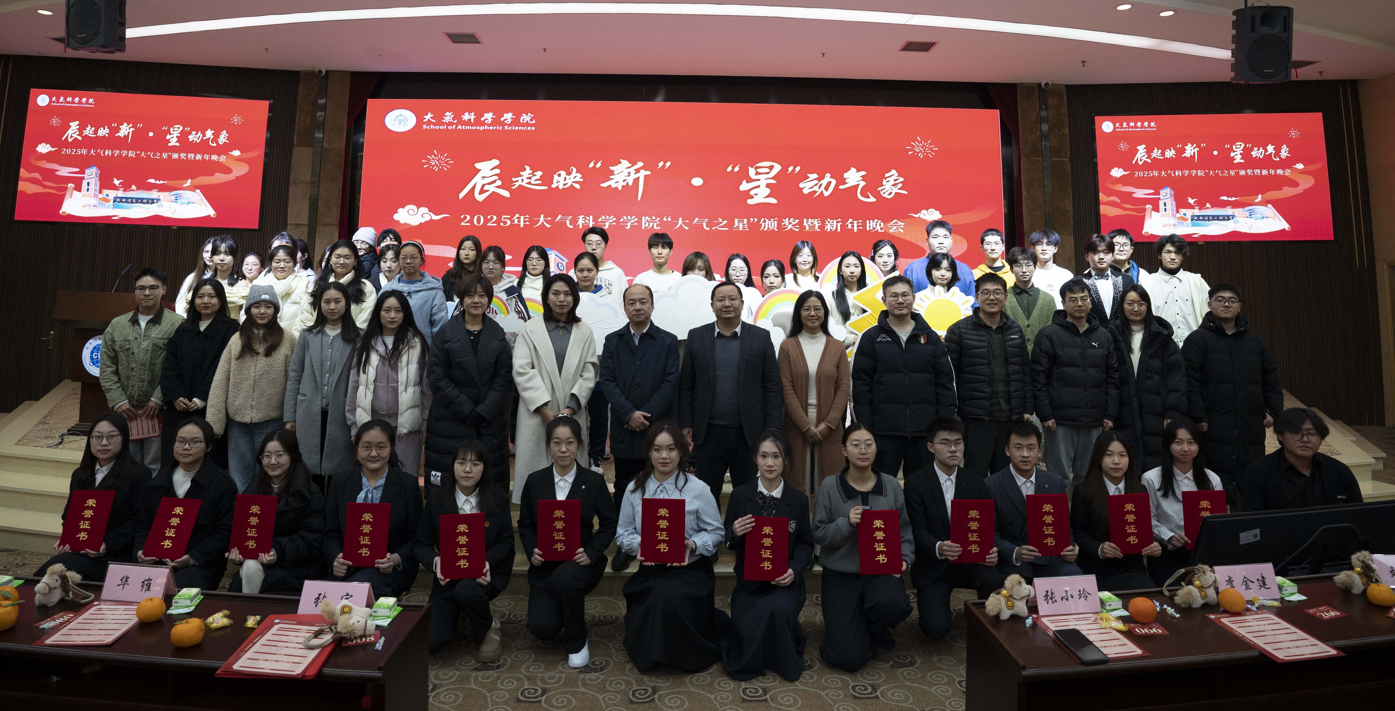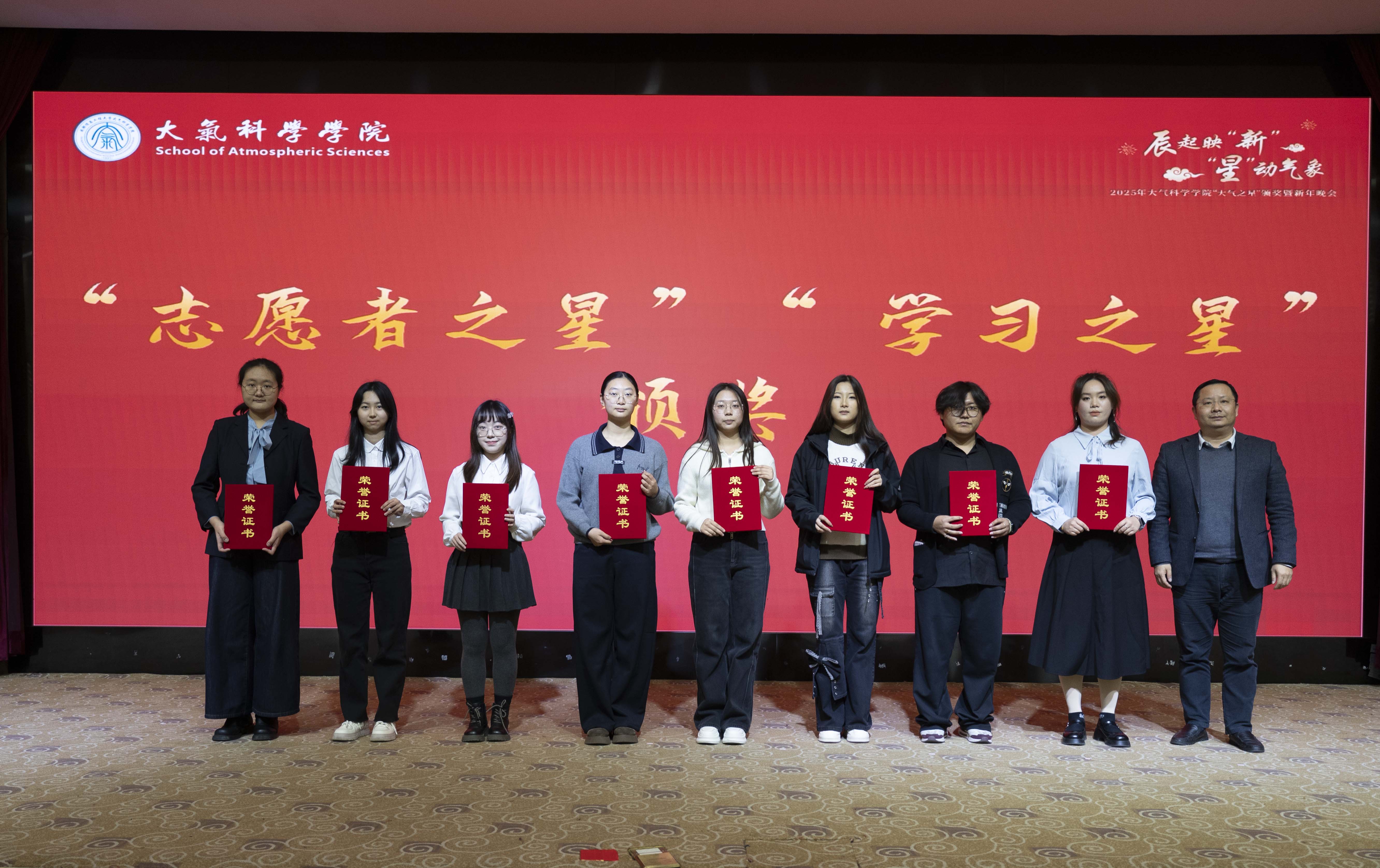 2026年1月9日晚19时,成都信息工程大学航空港校区国际会议厅气氛热烈、暖意融融,大气科学学院“辰起映‘新’·‘星’动气象”——2025年“大气之星”颁奖典礼暨新年晚会在此隆重举行。学院党委书记张宇、院长华维,学校党委学生工作部副部长陈敏,校团委及各兄弟学院教师代表,学院全体辅导员、2025级班主任,与近500名学生代表共同参加了此次活动。