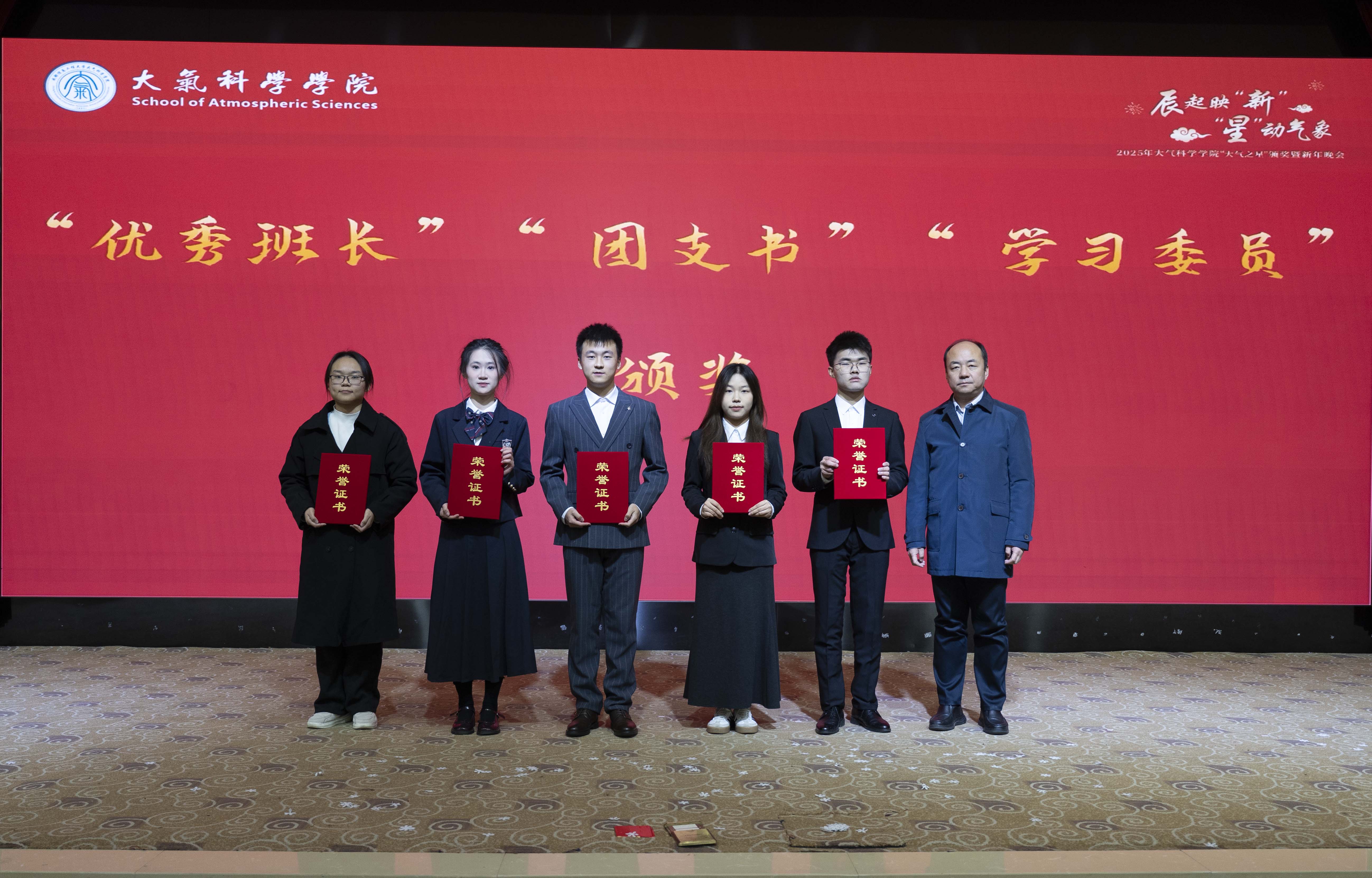 随后,进入“大气之星”颁奖环节。本年度共评选出卓越之星、科创之星、志愿者之星、学习之星及优秀学生骨干五大类奖项。获奖学生代表依次上台分享奋进故事:“卓越之星”宋增玥讲述了全面发展的成长轨迹;“科创之星”金星、张佳锦展现了勇于探索的科研精神;“志愿者之星”杨蕊菡分享了奉献温暖的初心;“学习之星”彭勃道出了勤学不辍的坚持;优秀学生骨干黄俊璋、肖杨、罗琨尧则诠释了服务集体的担当。他们的感人事迹与真挚讲述,赢得了全场阵阵掌声。学院及学校相关领导、老师分别为获奖同学颁发了荣誉证书。