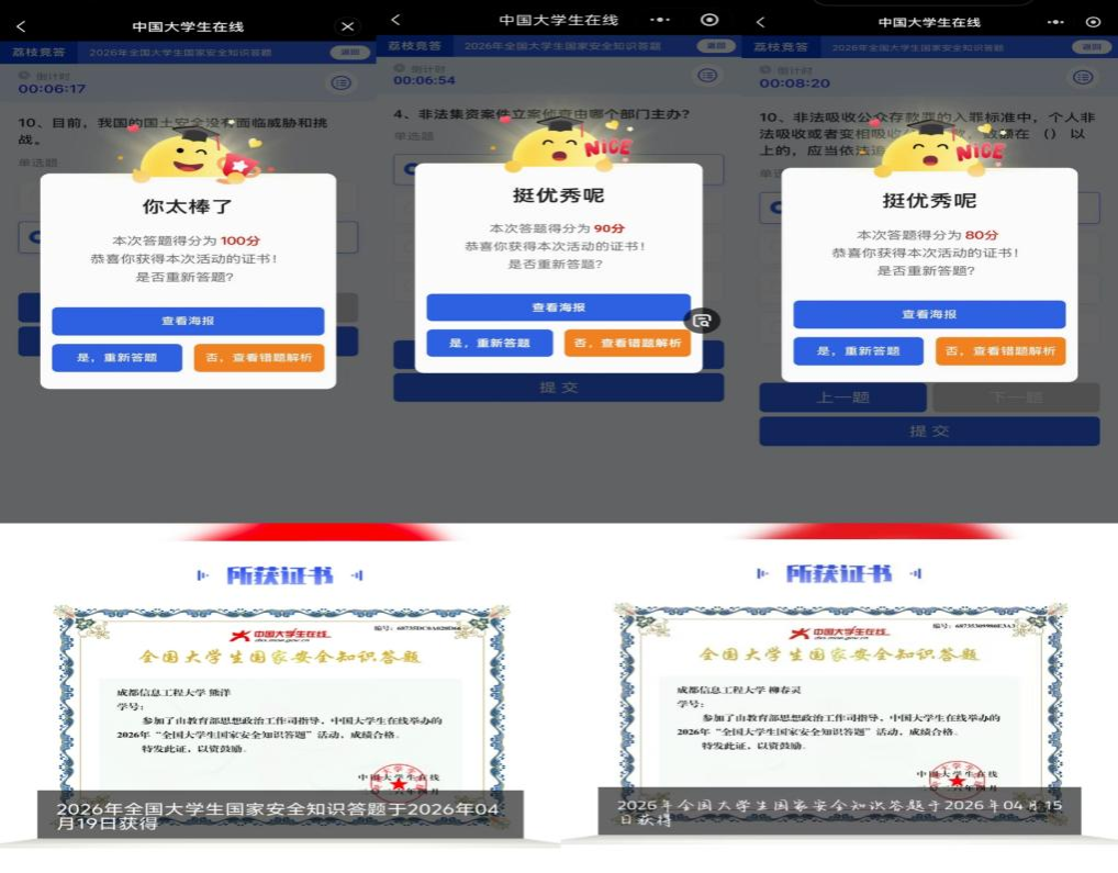 参与知识竞答,以赛促学促行。4月15日至24日,学院广泛动员全体学生参与“全国大学生国家安全知识答题”活动。各班级通过召开主题班会、班级群通知等多种形式进行全覆盖宣传动员,引导学生通过官方平台参与线上答题。题目内容覆盖政治、国土、网络、科技等多个安全领域,旨在以“以答促学、以学促行”为目标,帮助师生系统掌握国家安全基础知识,提升风险识别与防范处置能力,持续强化维护校园稳定、捍卫国家安全的责任意识与行动素养。